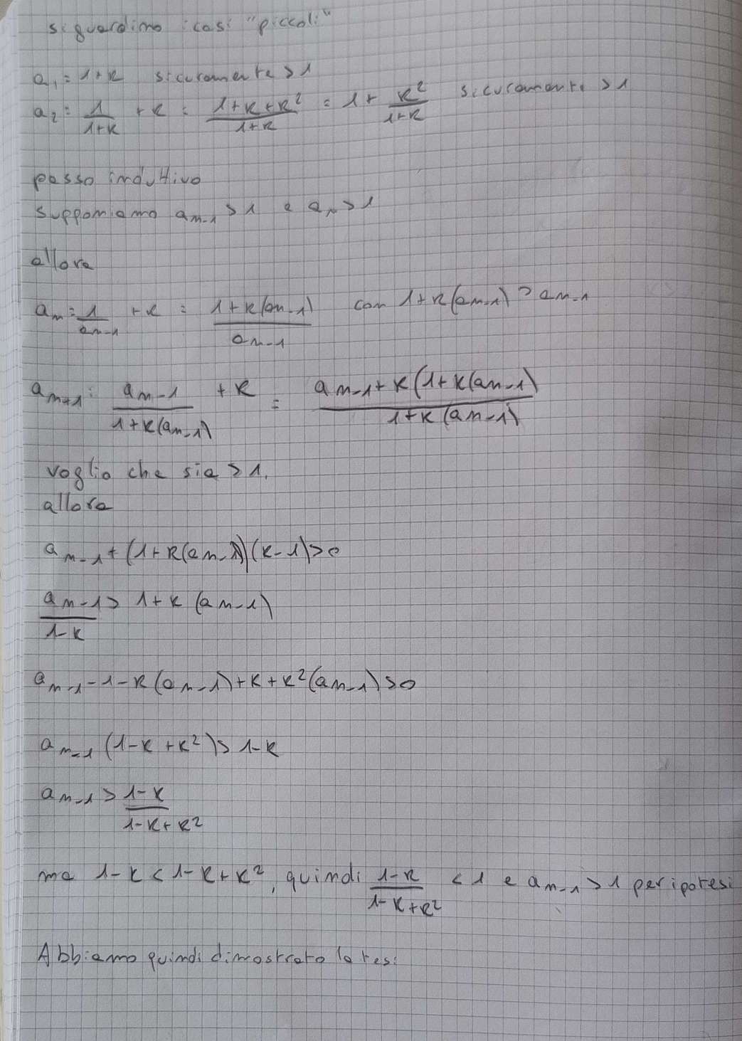 E quindi il numeratore è la somma tra 1 e un numero superiore a k, mentre il denominatore è somma di k e un numero inferiore a 1 (1/ a[n-1]), quindi il numeratore è superiore al denominatore e quindi: